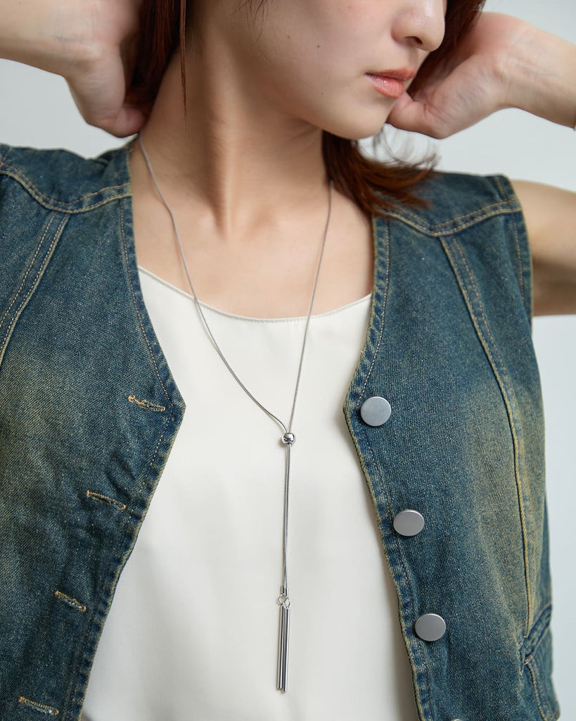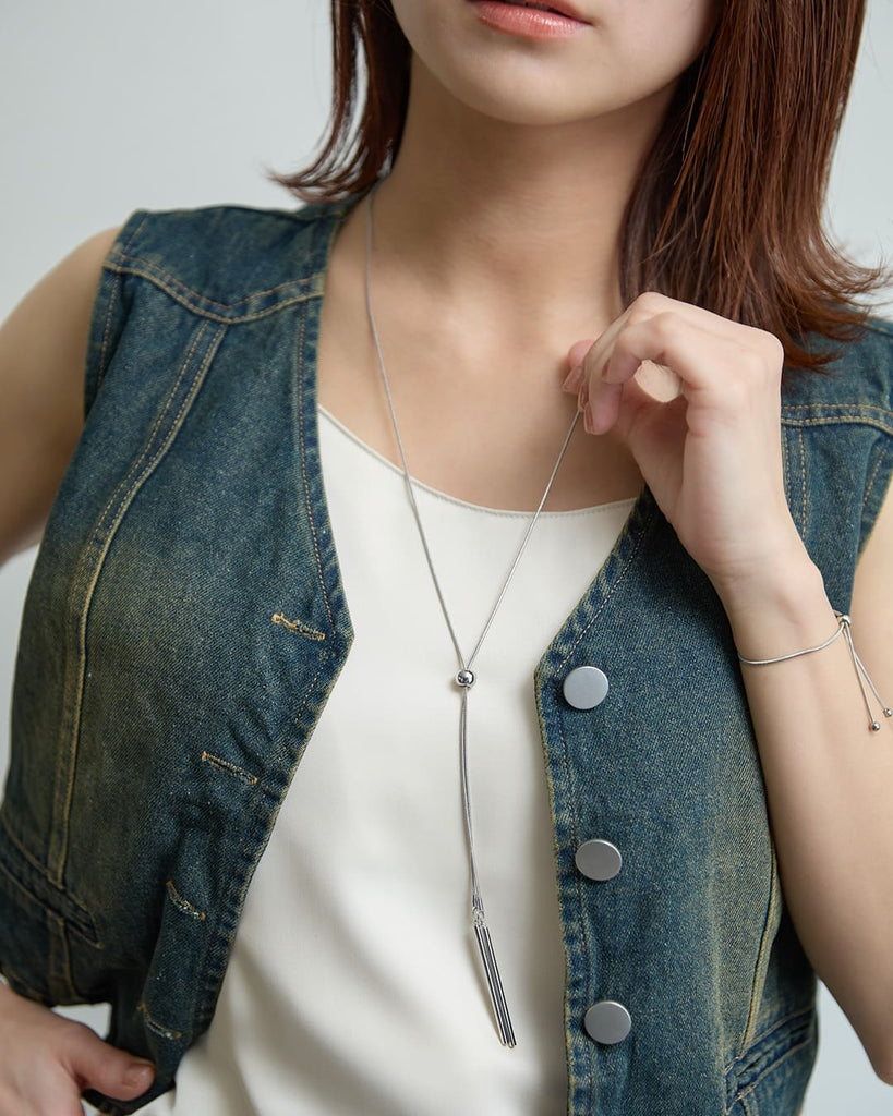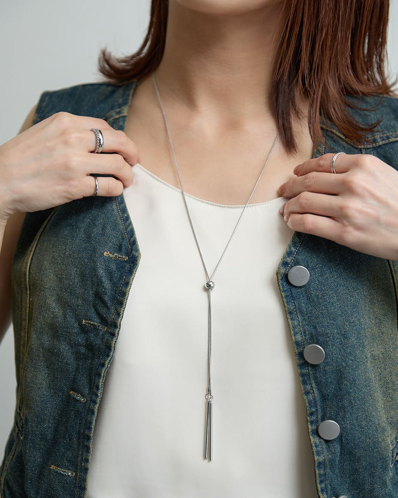 すらりと伸びるバーと繊細なチェーンが、洗練された大人のムードを演出するループタイネックレス。