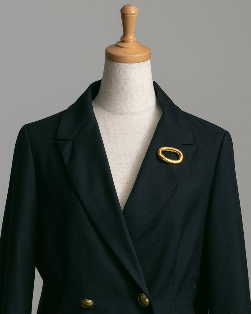 リング状のデザインには、「つながり」や「完成されたかたち」というイメージを重ねています。主張しすぎず、けれど印象に残る存在感。スリークリングブローチは、装いを静かに格上げするためのシンプルな答えとして生まれました。